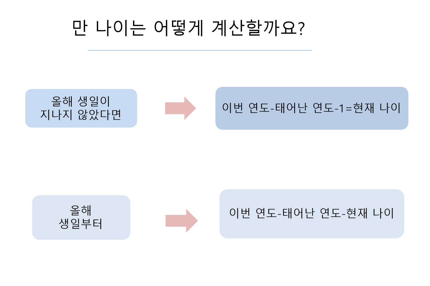 올해 생일부터 이번연도 -태어난 연도= 현재 나이