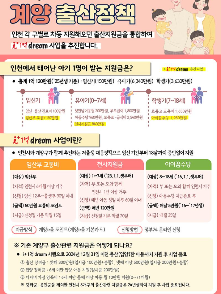 인천 각 구별로 차등 지원하던 출산지원금을 통합하여 i+1억 dream 사업을 추진합니다.(강화군ㆍ옹진군을 제외한 인천시 8개 구의 출산관련 지원금은 24년생까지 지원 후 사업 일괄 종료)